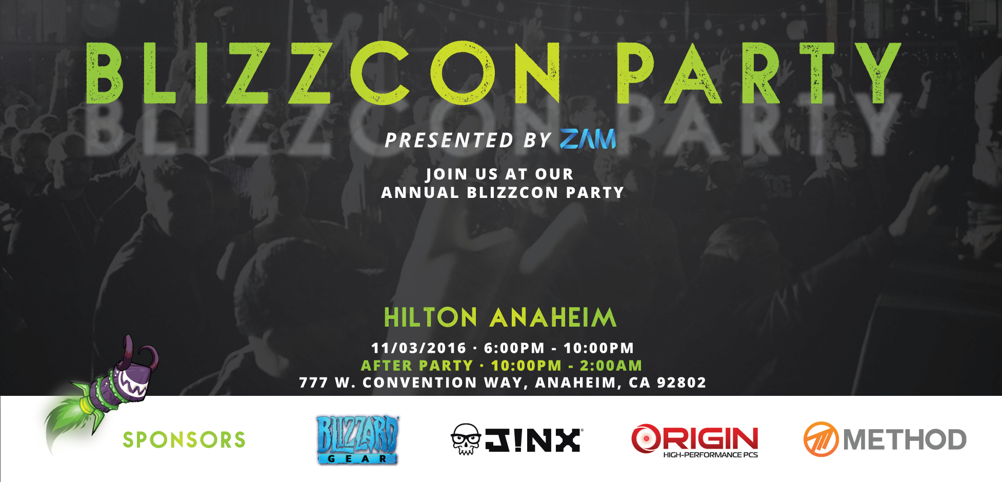 WELCOME PEEPS to Wowhead's annual BlizzCon Party! Grab your doomhammer (the plastic one) and come on down to the Anaheim Hilton to shake your booty and take home a plush! The party kicks off on November 3rd on the 5th floor of the Hilton from 6-10PM and powers down to a soft after party hangout on the 2nd floor from 10PM-2AM.